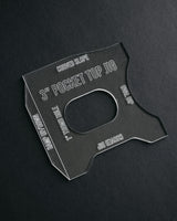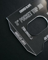 This nifty little template helps you create the tops of vertical card pockets. Most vertical card wallet designs are 3” wide x 4” tall. This little jig features 4 different card pocket tops and a 1” x 1.5” thumb slot.
