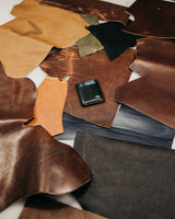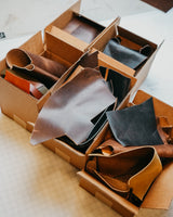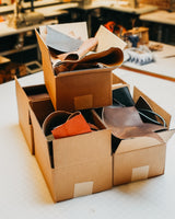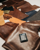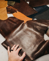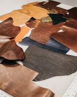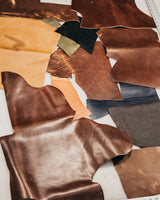 The Royal Remnant Boxes contain premium scrap leather. Each box contains roughly 12+ square feet of various thicknesses of chrome and vegetable leather. These types of leathers are used daily at Little King Goods.